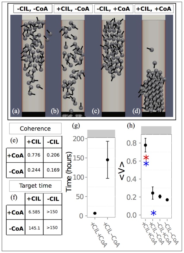 Figure 3. Relationship between CIL, co-attraction and collective migration.(a–d). Images taken at approximately half of the baseline collective target time. (a). −CIL,−CoA, where migration can be seen to be less efficient than in (b) and (d). (b). +CIL,−CoA (c). −CIL,+CoA, (d). +CIL,+CoA. (e). Table of coherence measures for the four cases. (f). Table of collective target times for the four mutually exclusive cases. (g). Collective target time for the cases +CIL,+CoA and +CIL,−CoA. The cases −CIL,−CoA and −CIL,+CoA are omitted as the time was greater than 150 hours. (h). Coherence measure of the four cases, shown in black. Blue star indicates the automated tracking value for the model and the red star shows the experimental data tracking software value.