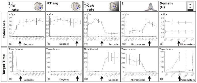 Figure 4. Coherence measure and collective target time.Data points represent the mean value over 10 independent simulations and error bars represent one standard deviation from the mean. Black arrows represent baseline parameter values. (a). Variation of 1/(RT rate) showing coherence. (b). Variation of the angle by which the cells can deviate during RT showing coherence. (c). Variation of 1/(CoA rate) showing coherence. (d). Variation of the diffusion length showing coherence. (e). Variation of the domain width showing coherence for weak (dashed) and strong co-attraction (solid line). (f). Variation of 1/(RT rate) showing collective target time. (g). Variation of the angle by which the cells can deviate during RT showing collective target time. (h). Variation of 1/(CoA rate) showing the collective target time. (i). Variation of the diffusion length, showing the collective target time. (j). Variation of the domain width showing the collective target time for weak (dashed) and strong co-attraction (solid line).