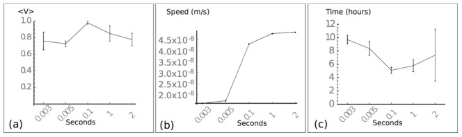 Figure 5. Optimal rate of response to co-attraction.System behaviour for strong co-attraction, showing an optimal rate at 1/(CoA rate). (a). Coherence is maintained for high rates of co-attraction. (b). Speed is reduced as the rate of co-attraction increases. (c). Collective target time. The smallest target time occurs at 1/(CoA rate).