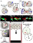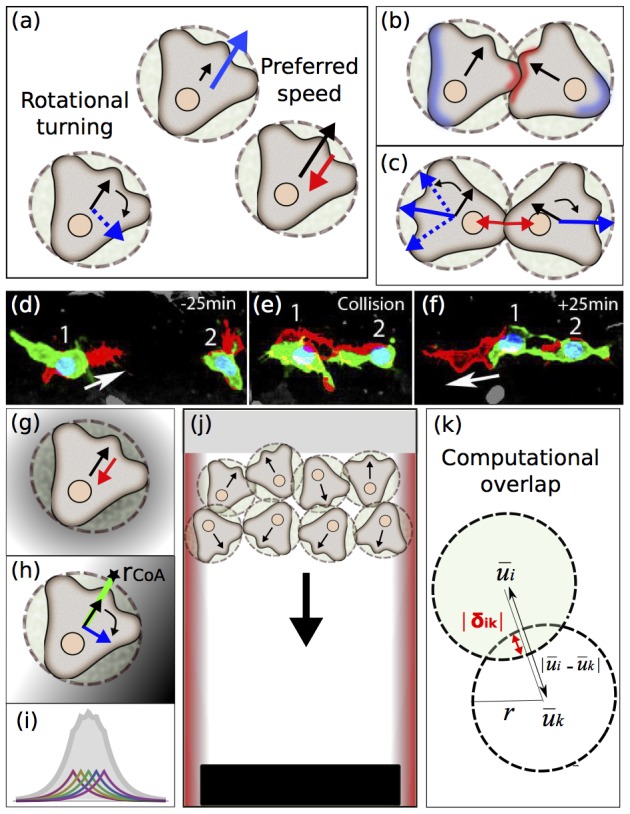 Figure 1. Discrete element model.Disks (broken lines) represent simulated cells, with cartoon NC cells overlaid. The polarity of each cell is shown (black arrow) and the forces attenuating or amplifying protrusion formation are indicated with red and blue arrows (respectively). (a). Self-propulsion and rotational turning (blue dashed arrow) force terms: cells attempt to maintain an intrinsic speed and polarity by acceleration (blue arrow), and deceleration (red arrow). (b). CIL: as cells come into contact, contact forces exist at the contact region. In addition, biological intracellular communication promotes the retraction of protrusions near the contact site (red region). Intracellular communication affected by contact promotes protrusion formation at the free edge (blue region). (c). Forces applied during CIL: classical overlap and repolarization are indicated (solid red and blue arrows). Deviation from the classical theory of contact is represented as a random angle (blue dotted arrows). (dâf). Frames of a time-lapse movie of zebrafish NC migrating in vivo. Green labels GFP expressed in the NC under Sox10 regulatory elements; Red: cell protrusions. Two cells (1 and 2) are shown. Arrow: direction of migration for cell 1. (d). Before contact. (e). During contact protrusions collapse. (f). After CIL, protrusions are generated at the free edge. (g). Secretion of co-attractant: at the single cell level the cell experiences a retraction of protrusion. (h). Co-attraction for multiple cells: individual cells experience the co-attractant generated by the whole population and attempt to align their polarity to the gradient with the sensing ray (green line, star indicates the location of the measurement). (i). Typical surface profile of the co-attractant: individual sources and their sum are shown (colour and grey plots resp.). (j). Simulation set up, designed to represent NC streams in vivo: Cell positions represent the origination and initial conditions of the NC. The vertical borders represent the restrictive cues that surround the migratory stream. (k). Diagram representing the computational overlap, where overlap represents the deformation of the cells.