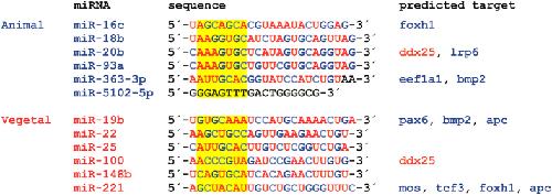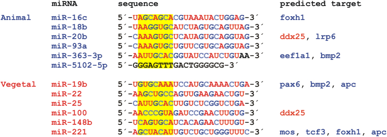 Figure 4. Sequences of the studied miRNAs and their predicted target mRNAs (animal mRNAs are shown in blue, vegetal mRNAs in red).Target prediction was performed using MicroCosm Targets Version 5 database (http://www.ebi.ac.uk/enright-srv/microcosm/htdocs/targets/v5/). The conservation is indicated by colored bases: red color indicates high evolutionary conservation, while blue color indicates low conservation. A sequence of miR-5102-5p indicated in black and two nucleotides on the 3´ end of miR-363-3p were not found in the database. Yellow boxes indicate miRNA seed sequences (from 2nd to the 8th nucleotide in the 5´ end).