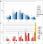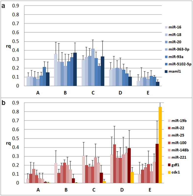 Figure 2. Intracellular profiles of the miRNAs and the selected reference mRNAs measured using qPCR tomography (maml1- dark blue, gdf1 â dark red, cdx1 - yellow).Y-axis indicates relative quantity and x-axis indicates the section from the animal pole (section A) to vegetal pole (section E). a. Spatial profiles of miR-16c, miR-18b, miR-20b, miR-93a, miR-363-3p and miR-5102-5p (indicated in blue scale), which are predominant in the animal hemisphere like the mRNA maml1 (dark blue). b. Intracellular profiles of miR-19b, miR-22, miR-25, miR-100, miR-148b, and miR-221 (indicated in red scale), which are predominant in the vegetal hemisphere like the mRNA gdf1 (dark red). Also shown is the mRNA cdx1 (yellow), which has an extreme vegetal profile.