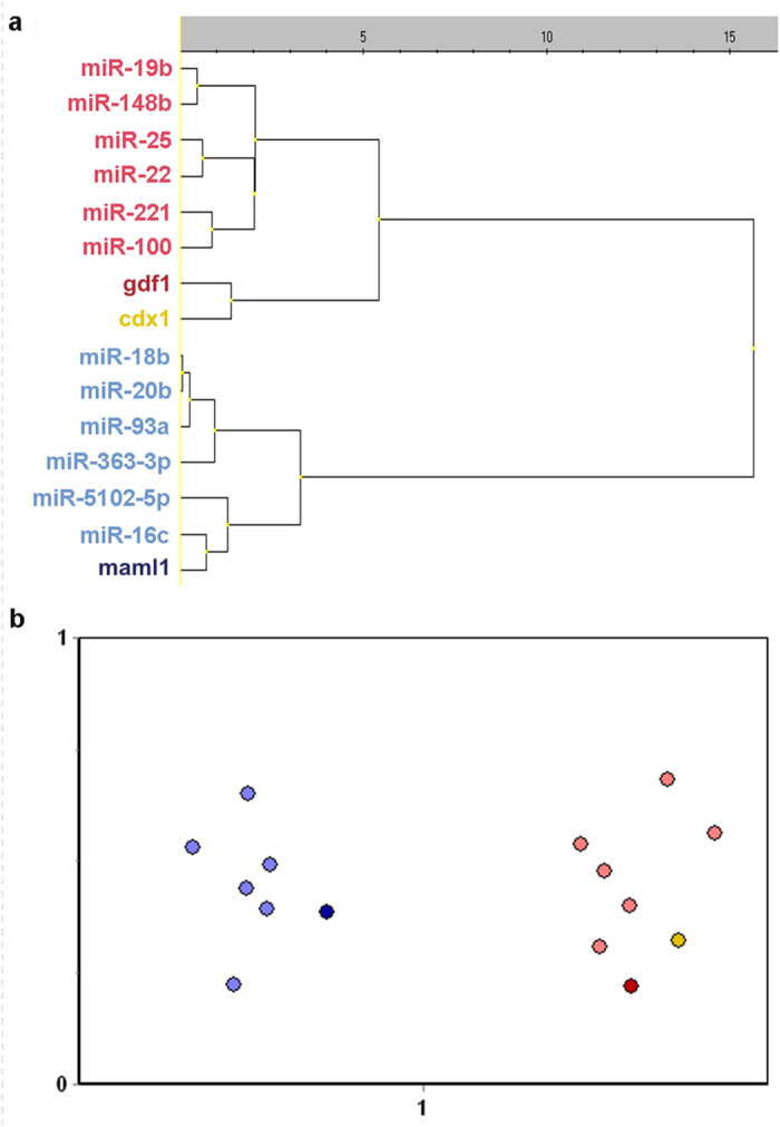 Figure 3. Hierarchical clustering(a) and SOM classification (b) of intracellular profiles along the animal-vegetal axis of the Xenopus laevis oocyte. The hierarchical clustering is presented in a dendrogram, where the similarity between miRNAs/mRNAs is indicated by the distance at which they are joined. Both the dendrogram and the SOM clearly separate the miRNA and mRNA profiles into two clusters. miR-16c, miR-18b, miR-20b, miR-93a, miR-363-3p and miR-5102-5p (light blue) cluster with animally localized mRNA maml1 (dark blue), while miR-19b, miR-22, miR-25, miR-100, miR-148b, and miR-221 (light red) cluster with vegetally localized gdf1 (dark red) and cdx1 (yellow) mRNAs.