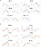 Figure 1. a. Individual intracellular profiles of miR-16c, miR-18b, miR-20b, miR-93a, miR-363-3p and miR-5102-5p predominantly localized in the center of the oocyte with slight asymmetry towards the animal hemisphere. Blue lines indicate oocytes from the first female and green lines indicate oocytes from the second female. b. Individual intracellular profiles of miR-19b, miR-22, miR-25, miR-100, miR-148b, and miR-221 localized in the vegetal hemisphere. Red lines indicate oocytes from the first female and orange lines indicate oocytes from the second female. Y-axis indicates relative quantity and x-axis indicates the section from the animal pole (section A) to vegetal pole (section E).