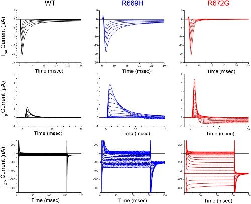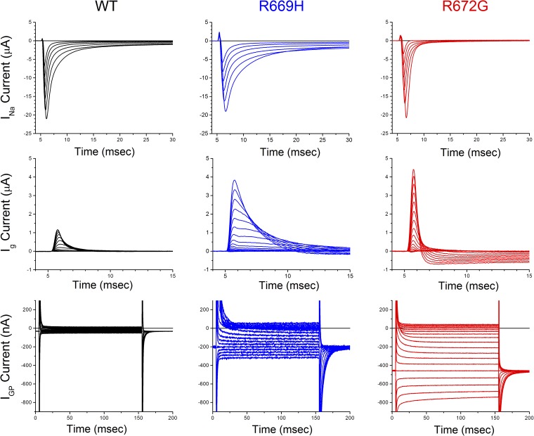 Figure 1. Currents, recorded under different conditions for the same oocyte, to measure INa, Ig, and IGP. First, Na+ currents were recorded in a 115-mM Na+ bath with analogue compensation for linear capacitance and digital P/N subtraction of residual linear leak (top row). Responses are shown for test potentials of −20 to 30 mV. The external solution was then exchanged with K+/TTX (R672G) or NMDG+/TTX (R669H or WT), and P/N leak subtraction was performed to reveal the nonlinear gating charge displacement current, Ig (middle row). Finally, all analogue and digital P/N leak subtraction was omitted to reveal the gating pore current for mutant channels and the residual leakage current for oocytes expressing WT channels (bottom row). Each column shows the responses recorded from a single oocyte (black, WT; blue, R669H; red, R672G).