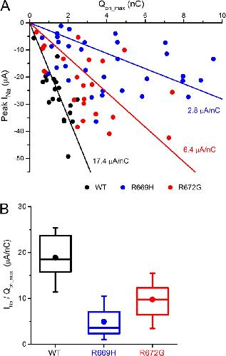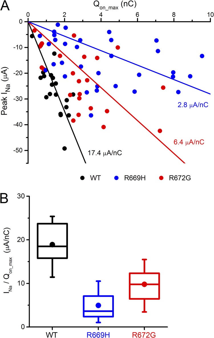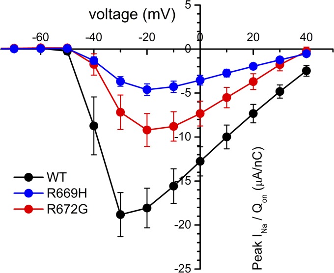 Figure 2. Voltage dependence for peak INa, normalized by maximal on-gating charge displacement, Qon_max. Symbols show mean and SEM for WT (black; n = 15), R669H (blue; n = 34), and R672G (red; n = 18). Oocytes for which the maximal INa occurred at a voltage of less than −30 mV were excluded to reduce the effect of inadequate voltage-clamp control. Error bars represent ± SEM.