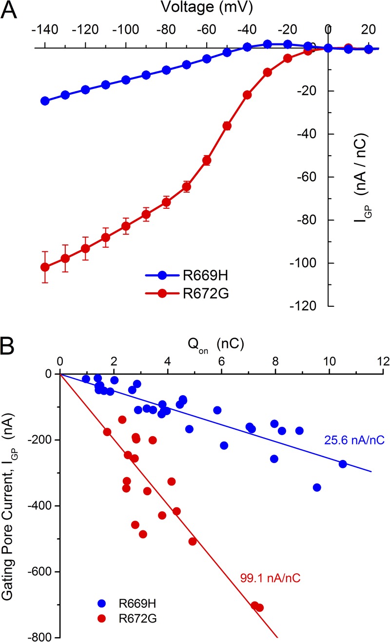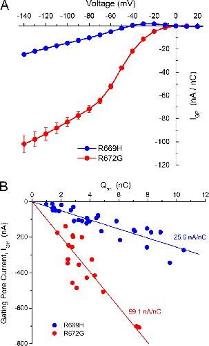 Figure 4. Gating pore currents in HypoPP mutant channels. (A) The gating pore current was measured as the steady-state current at the end of a 150-ms pulse that was leak corrected by subtraction of the average steady-state current recorded from oocytes expressing WT NaV1.4. The gating pore current from each oocyte was normalized by Qon_max for the same egg and plotted as a function of test potential. Symbols show mean and SEM for R669H mutants (blue; n = 32) and for R672G mutants (red; n = 18). Error bars represent ± SEM. (B) The correlation between the gating pore current measured at −140 mV and Qon_max is shown as a scatter plot. Each symbol represents the response from a separate oocyte. Lines show the best fit constrained through the origin. The correlation for IGP–Qon_max had much less variance than for INa–Qon_max measured from the same set of oocytes (Fig. 3 A).