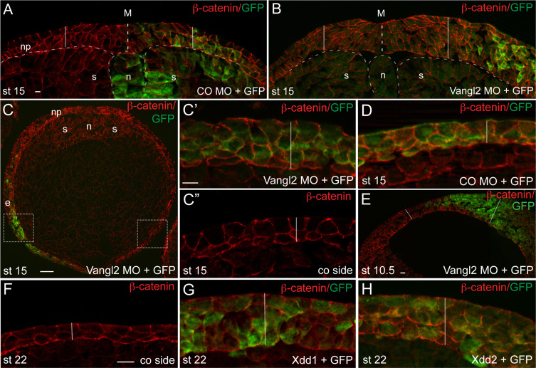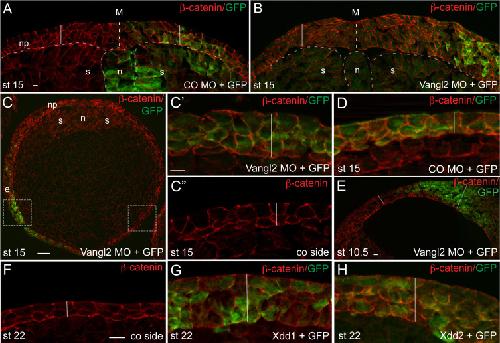 Fig. 6. Radial intercalation of deep layer cells is inhibited in embryos deficient in PCP signaling. Four-to-eight-cell embryos were unilaterally injected into prospective dorsal or ventral ectoderm with control MO (A, CO MO, 15â20 ng) or Vangl2 MO (B, 15â20 ng). Coinjected GFP RNA (0.1 ng) is a lineage tracer. Embryos were cross-sectioned at stage 15 and immunostained for β-catenin to mark cell boundaries and GFP to identify the injected side of the embryo. Dashed lines mark notochord and somite boundaries. Vertical white bars indicate the thickness of the neural plate, which is increased in Vangl2-depleted tissues. Scale bar is 20 μm. M, midline (dashed line); Np, neural plate; s, somites; n, notochord. (CâE) Thickness of non-neural ectoderm is controlled by PCP signaling. (C) Injected embryo shown at low magnification. White boxed areas approximately correspond to those shown at higher magnification in Câ² (injected side) and Câ² (control uninjected side). Scale bar is 100 μm in C, 20 μm in Câ², also applies to Câ², D, E. Abbreviations: e, ectoderm; n, notochord; s, somites. (D) Control MO does not change ectoderm morphology. (E) The effect of Vangl2 MO on ectoderm thickness in stage 10.5 embryo. Up to 5â6 cell layers are visible after Vangl2 depletion (white bar) as compared with the uninjected side, containing 2 to 4 cell layers. Bar, 40 µm. (FâH) Thick ectoderm in embryos expressing the dominant interfering Disheveled constructs Xdd1 and Xdd2. Shown are representative sections of a control embryo (F) or embryos injected with 1 ng of Xdd1 (G) or Xdd2 (H) RNA into a ventral animal blastomere and immunostained for GFP and β-catenin to mark cell boundaries. White bars indicate ectoderm thickness (CâH). |