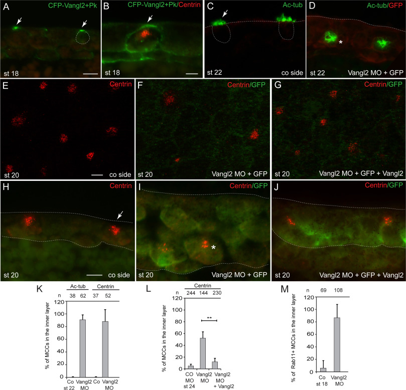 Fig. 1. Vangl2 is required for the migration of skin multiciliated cells. (A, B) The Vangl2/Pk complex has a polarized apical distribution in MCC precursors. Four-cell embryos were injected with RNAs encoding CFP-Vangl2 (0.1 ng) and Pk (0.05â0.1 ng), embryos were fixed at stage 18 and immunostained with anti-GFP (A) or anti-GFP and anti-centrin antibodies (B). Arrows point to apically polarized Vangl2. Scale bar in A is 20 µm, bar in B, 10 µm, also applies to C, D. (CâJ) Depletion of Vangl2 inhibits MCC intercalation into the superficial cell layer. Four-cell embryos were unilaterally injected with Vangl2 MO (10 ng per blastomere) and GFP RNA (0.1 ng) for lineage tracing with or without HA-Vangl2 RNA (0.1 ng). The embryos were fixed at indicated stages and immunostained for GFP and acetylated tubulin (Ac-tub) (C, D) or centrin (EâJ) to mark MCCs. (EâJ) Vangl2 RNA injection partly rescues MCC intercalation defect caused by Vangl2 MO. (EâG) En face view. (HâJ) Embryo sections. Arrows point to MCCs in the superficial cell layer. Asterisks indicate a deficiency in MCC migration. The apical surface position (at the top) and MCC boundaries are shown by dotted lines. Scale bars in E, H are 10 µm. (KâM) Quantitation of data for the experiments shown in (CâJ) and Fig. S1. The percentage of MCCs that fail to migrate and remain in the deep cell layer was calculated separately for Ac-tub (K), centrin (K, L) or Rab11 (M) relative to the total number of MCCs. Number of scored MCCs (n) is shown on top of each bar. All graphs present means±s. e. Statistical significance was determined by the Student's t-test (**, p=0.014). Data are representative of two to four independent experiments, 4â7 embryos were examined for each treatment. |
