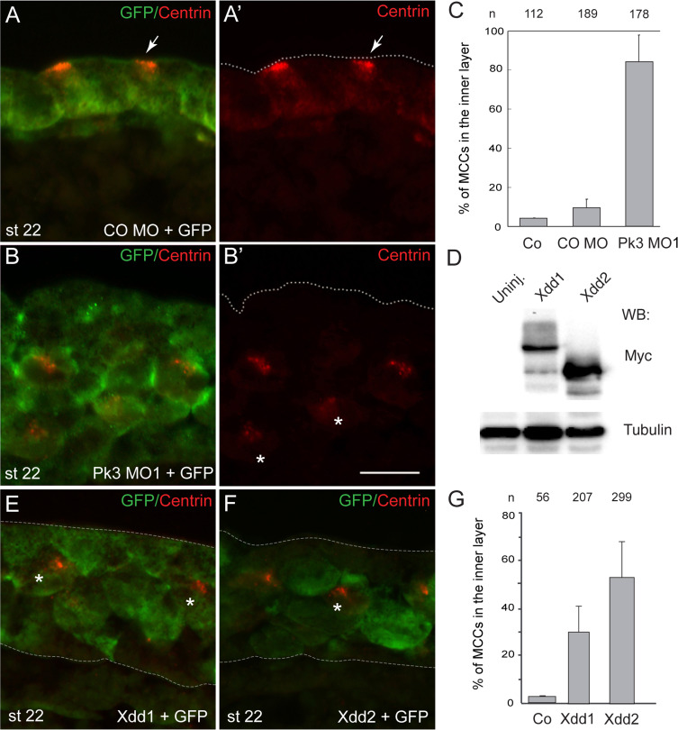 Fig. 3. Interference with Pk3 and Disheveled leads to MCC intercalation defects. (AâC) Role of Pk3 in MCC intercalation. Four-cell embryos were injected with control morpholino (COMO) or Pk3 MO1 (25 ng per blastomere), along with GFP RNA (0.1 ng) as a lineage tracer. Stage 22 embryos were cryosectioned and immunostained for Centrin and GFP. Arrows indicate MCCs integrated into the superficial cell layer. Asterisks point to MCCs that failed to migrate. Dashed lines mark the boundaries of the epidermis, apical is up. (DâG) Effects of Disheveled mutant constructs on MCC intercalation. Xdd1 and Xdd2 RNAs (0.5â1 ng each) were coinjected with GFP RNA into four-cell embryos, embryos were either lysed at stage 11 for protein analysis (D) or fixed at stage 22 and immunostained for GFP and Centrin (E, F). (D) Immunoblot analysis with anti-Myc antibodies showing Xdd1 and Xdd2 expression levels. Scale bar in B is 20 μm, also applies to (A, E, F). (C, G) Quantification of data. Scoring has been done as described in Fig. 1. All graphs show means±s. e. At least 6â10 embryos were examined per each treatment. n, number of examined cells. |