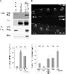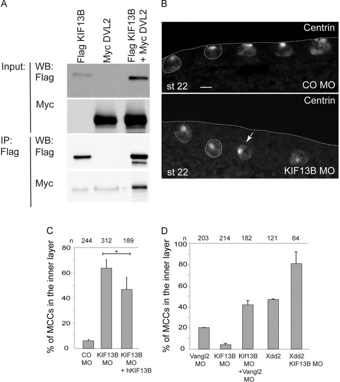 Fig. 4. KIF13B is a Disheveled-interacting protein that synergizes with PCP signaling to regulate MCC intercalation. (A) KIF13B co-immunoprecipitates with Disheveled. HEK293T cells were transfected with Myc-Dvl2 and FLAG-KIF13B. KIF-13B complexes were pulled down from cell lysates using anti-FLAG antibodies coupled to agarose, and both KIF13B and Myc-Dvl2 were visualized by western blotting. (B) Depletion of KIF13B affects MCC integration into the superficial cell layer. Control MO or KIF13B MO (40 ng each) were injected into 8-cell stage embryos. MCC migration was analyzed in cryosections of stage 22 embryos by immunostaining for centrin. Depletion of KIF13B induced MCC migration defects (arrow). Scale bar is 15 μm. (C). Quantification of MCC migration defects. Rescue experiments were performed by co-injecting KIF13B MO with 150 pg of human MYC-tagged KIF13B RNA. Data are presented as means±s. e. Statistical significance was determined by the Student's t-test (*, p<0.05). (D) Synergistic effects of KIF13B, Vangl2 and Disheveled on MCC intercalation. Eight-cell stage embryos were injected with Vangl2 MO (5 ng), KIF13B MO (10 ng), or Xdd2 mRNA (0.25 ng), separately or in combination as indicated. MCC migration was quantified as in (C). |