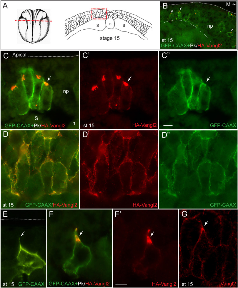 Fig. 5. Polarized distribution of PCP proteins in embryonic neuroectoderm. (A) Scheme of neurula stage embryo and a transverse section of the Xenopus neural plate at the hindbrain level. Dashed line indicates section plane. The boxed area indicates an approximate location of images. (B) Neural plate section with apically directed Vangl2/Pk complexes shown at low magnification. Eight-cell embryos were injected into animal-dorsal blastomeres with RNAs encoding HA-Vangl2, Pk and GFP-CAAX (0.1 ng each). The embryos were cultured until stage 15, cross-sectioned and immunostained with indicated antibodies. The apical surface is at the top as indicated by dashed lines. Midline (M) is to the right. Arrows point to the polarized Vangl2/Pk complex in deep neuroctodermal cells. (CâCâ²) The localization of the Vangl2/Pk complex in embyos coinjected with HA-Vangl2 and Pk RNAs as compared to the lineage tracer GFP-CAAX. np, neural plate; s, somite; n, notochord. Scale bar in Câ is 10 μm, also applies to (DâDâ²). (DâDâ²) HA-Vangl2 is not significantly polarized in the neural plate in the absence of overexpressed Pk. (E) A protrusion directed towards the outer surface (arrow) is detectable in a single GFP-CAAX-marked cell. (F, Fâ²) A single deep layer cell containing an apical protrusion with enriched Vangl2/Pk complex (arrow). Scale bar is 10 μm, also applies to E, G. (G) Staining of neuroectoderm with anti-Vangl2 antibodies reveals apically enriched endogenous Vangl2 in an inner layer cell. |