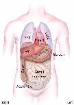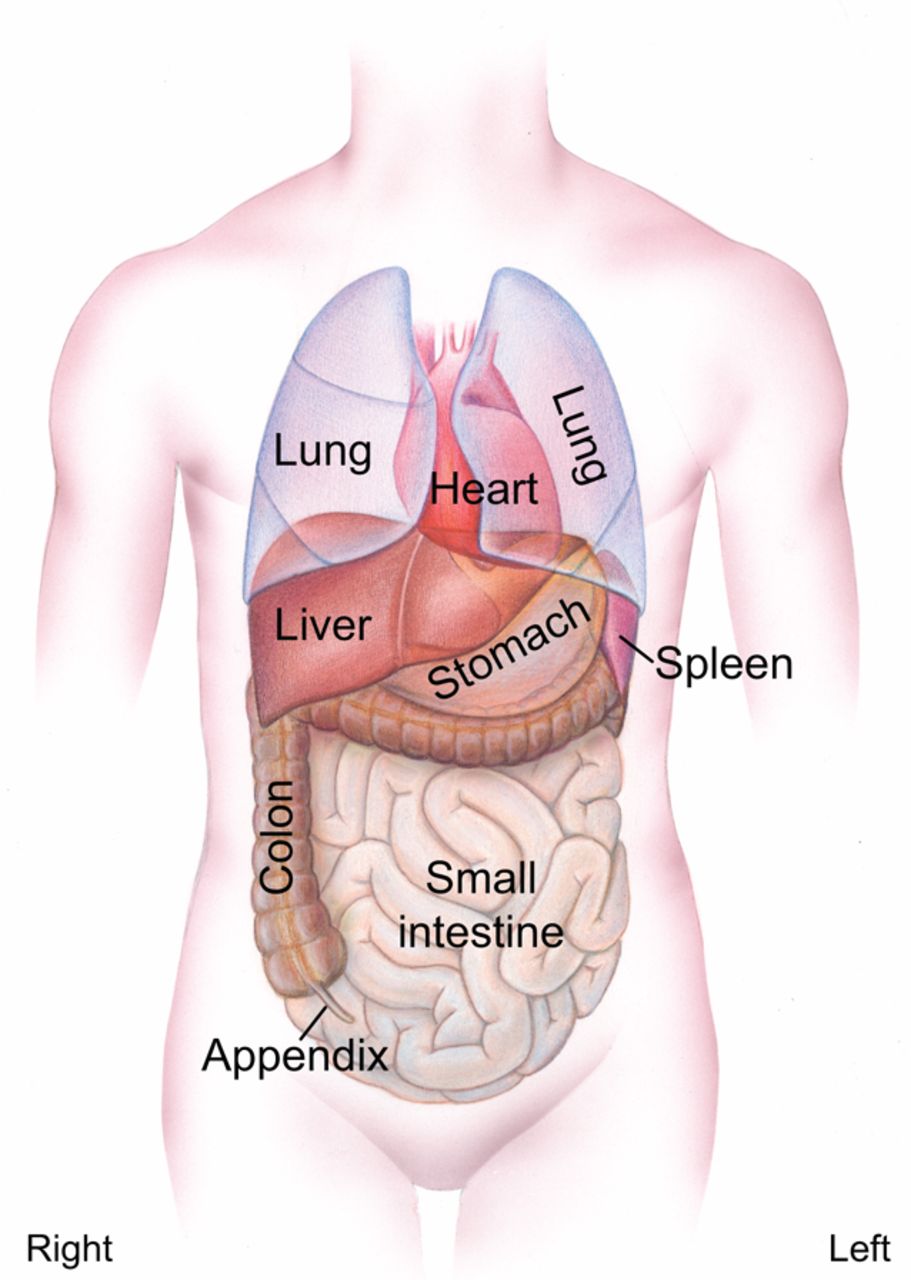 Fig. 1. Asymmetric organs. In humans, asymmetric organs are found in the chest (heart, lung) and abdomen (stomach, spleen, liver, small and large intestine). The apex of the heart, which is placed at the midline, points to the left side. Lungs differ with respect to lobation: two lobes are found on the left and three lobes on the right side. The stomach and spleen are positioned on the left, whereas the liver and appendix are found on the right. In addition, the small intestine and colon coil asymmetrically.