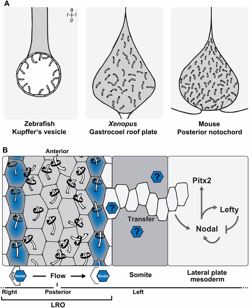 Fig. 2. Left-right organizers and the flow model of symmetry breakage. (A) Left-right organizers (LROs) come in different forms (Blum et al., 2007). In zebrafish, the LRO is known as Kupffer's vesicle and is a closed sphere. In Xenopus, the gastrocoel roof plate (GRP) acts as the LRO and is a flat triangular to diamond-shaped epithelium. In mouse, the LRO (the posterior notochord/ânodeâ) is an indentation at the distal tip of the egg cylinder. In all cases the LRO is positioned at the posterior pole of the notochord (gray). Axes are indicated: a, anterior; p, posterior; l, left; r, right. (B) Depiction of leftward flow at the ciliated epithelium of an LRO. Motile and polarized cilia (positioned at the posterior pole of cells) rotate in a clockwise fashion to produce a leftward fluid flow in the extracellular space. Flow is sensed by unpolarized cilia on cells bordering the LRO. In mouse and Xenopus these cilia have been described as being immotile (Boskovski et al., 2013; McGrath et al., 2003). These cells express both Nodal and the Nodal inhibitor Coco. As a result of flow, Coco becomes downregulated on the left side (Hojo et al., 2007; Nakamura et al., 2012; Schweickert et al., 2010), thereby derepressing and liberating Nodal protein. Also shown is the transfer of an unidentified asymmetric signal (likely to be Nodal protein; blue octagon labeled with question mark) to the left lateral plate mesoderm (LPM), where the Nodal cascade is induced. Nodal transfers across the somites and intermediate mesoderm (not shown) to the LPM, where it induces its own transcription and that of its feedback inhibitor Lefty as well as expression of Pitx2.