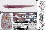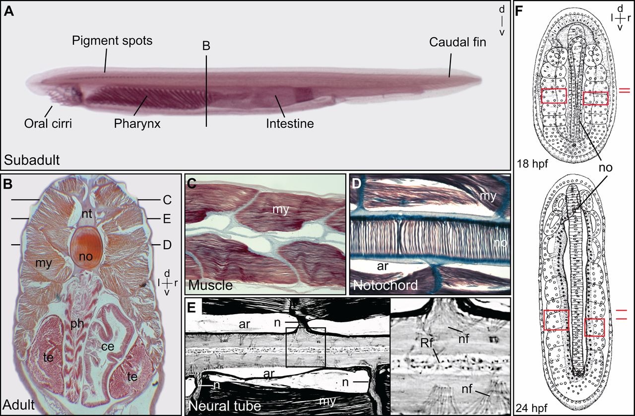 Fig. 5. Asymmetry in amphioxus. (A) Subadult animal (before differentiation of the gonads). Histological transverse (B) and longitudinal (C-E) sections of adult animals. The longitudinal sections were taken at the level of the dorsal muscle, dorsal to the neural tube (nt; C), at the level of the notochord (no; D) and at the level of the neural tube (E). Note the asymmetric body plan as reflected in the placement of the pharynx (ph), cecum (ce) and testes (te), and the alignment of muscles [myomeres (my)], nerve (n) and nerve fibers (nf). ar, fixation artifact; Rf, Reissner's fiber. (F) Reproduction of original drawings from Conklin's 1932 description of embryogenesis in amphioxus [reproduced with permission (Conklin, 1932)]. At 18â