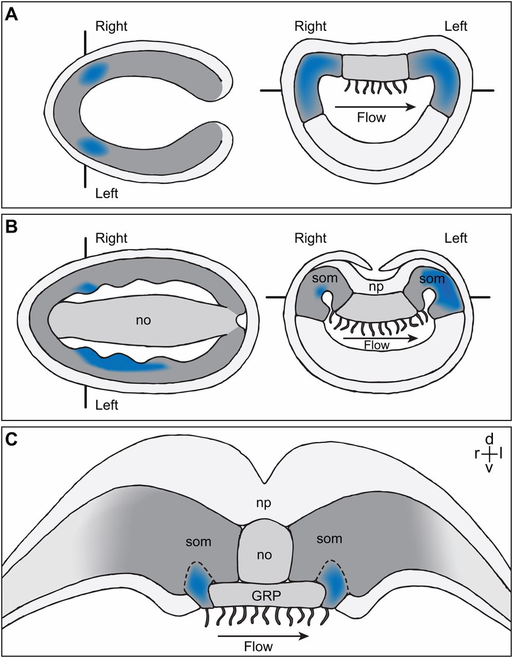 h neurula (B) embryos are shown (left) together with transverse sections (right) at the levels indicated. Nodal mRNA expression (blue) in amphioxus becomes asymmetric during early neurulation. Cells that are Nodal positive at late gastrula bud off from the archenteron roof to form the somites. At later stages, the epithelium in between the Nodal-positive cells likewise buds off to become the notochord (not indicated). Drawn according to Yu et al. (Yu et al., 2002). Cilia and flow at the notochordal part of the archenteron are a hypothetical prediction of the authors. (C) Schematic transverse section through a stage 17 Xenopus neurula embryo. Drawn according to Schweickert et al. (Schweickert et al., 2007). Note the striking homology between amphioxus and Xenopus GRPs: in both cases, lateral cells expressing Nodal are fated to become somites while central cells fold off to form (amphioxus) or integrate into (frog) the notochord. no, notochord; np, neural plate; som, somite.