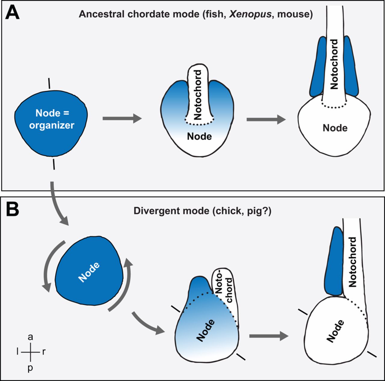 Fig. 7. Divergent modes of symmetry breakage in vertebrates. (A) Ancestral flow-based mode of chordates. The early gastrula organizer (node), which expresses Nodal (blue), differentiates into the notochord and somites during early neurulation. The notochord does not express Nodal and thus splits the Nodal-positive domain down the middle. Nodal-positive cells later integrate into the somites. (B) Divergent mechanism in chick and pig. The organizer (node) rotates during early gastrulation, which renders the node left-asymmetric. The notochord emerges over the right shoulder of the node and does not split the Nodal domain. Nodal thus becomes displaced to the left without the need for flow.