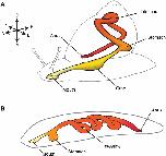 Fig. 3. Organ asymmetry evolved to store a regionalized and long gut tube. (A) The regionalized (as represented by the color gradient) gastrointestinal (GI) tract of a snail. Note that its length exceeds that of the main body axis. A compartmentalized GI tract that exceeds body length will inevitably be packaged asymmetrically. (B) We hypothesize that the urbilaterian GI tract was also regionalized and asymmetrically arranged. D, dorsal; V, ventral; other axes as Fig. 2.