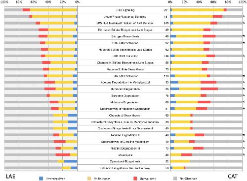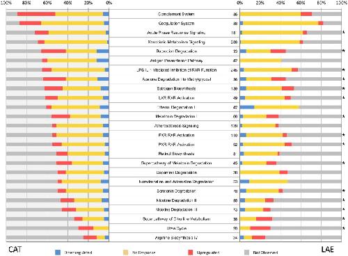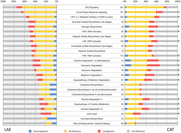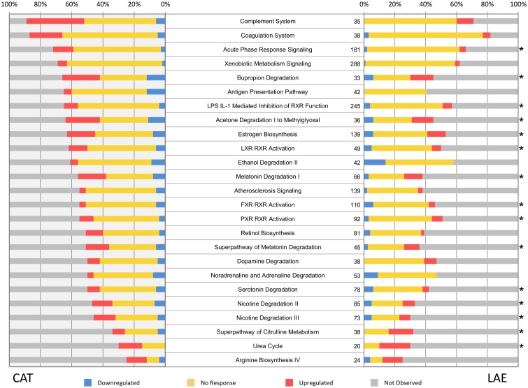 Fig 4. Pathway analysis for liver transcripts from R. catesbeiana (CAT) and X. laevis (LAE).Top 25 impacted pathways after TH treatment for R. catesbeiana ranked by the highest proportion of overall observed genes. The pathway names are indicated in the center of the figure with the total number of genes known in each IGA pathway indicated. The asterisk indicates those pathways that are found in the top 25 list of X. laevis. The colour coded bar plots illustrate the percentage of the total number of gene transcripts in a pathway that are downregulated (blue), non-responsive (yellow), upregulated (red) or not observed in the experiment (gray) relative to the control condition. Differentially expressed transcripts were determined using a p-value threshold of 5%.