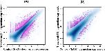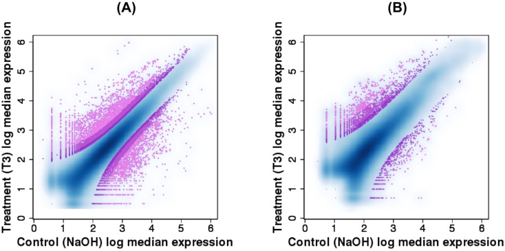 Fig 2. Differential expression of assembled transcripts for (A) R. catesbeiana and (B) X. laevis.Three shades of purple designate p-values of differential expression estimates 0.05, 0.02 and 0.002, lighter colours indicating lower thresholds.