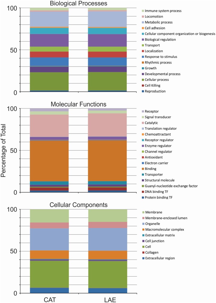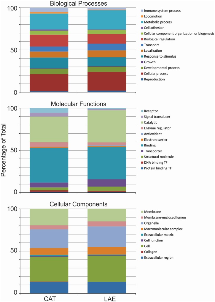 Fig 3. Gene ontology classification of DESeq-selected, TH-responsive R. catesbeiana and X. laevis liver transcripts with UniProtKB AC numbers.The two series in each stacked bar plot correspond to differentially expressed R. catesbeiana (CAT) and X. laevis (LAE) transcripts, with a p-value threshold of 5%.