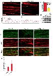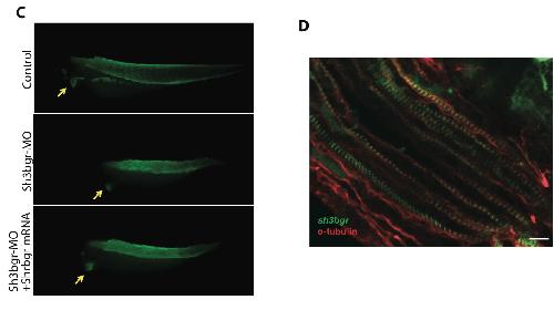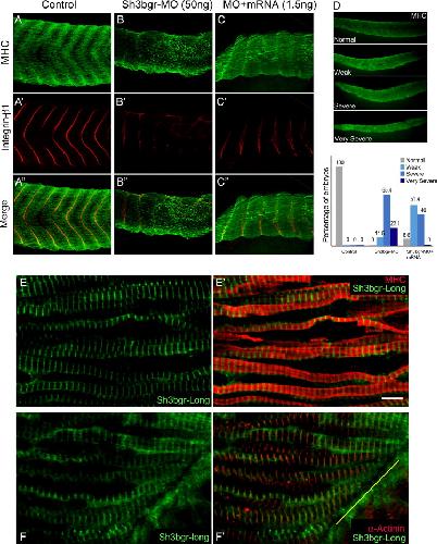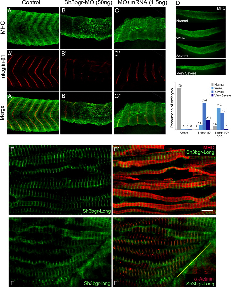 Fig. 2. Knockdown of sh3bgr caused severe defects in somite development. AâC. Microinjection of sh3bgr antisense morpholino (Sh3bgr-MO; 50 ng per embryo) disrupted normal somite development. The somite boundaries were labeled with anti-integrin-β1 antibody (Red) and the muscle fibers were stained with the myosin heavy chain (MHC) antibody (Green) at Stage 33. D. The muscle phenotypes were categorized according to the severity. Weak; the chevron pattern is partially disrupted, Severe; the chevron pattern is completely lost. Very severe; the somatic tissue is severely hypomorphic. The muscle defects in the morphants were recovered by co-injection with 1.5 ng of sh3bgr mRNA. The numbers in the graph are the percentage of the embryos. The numbers of embryos analyzed: Control-13, sh3bgr morphants-26, Rescue-35. E-Eâ. Sh3bgr localizes to the muscle fibers. 150ng of Sh3bgr-flag mRNA was injected into Stage 2 embryos. Stage 33 embryos were fixed and the coronal sections of somitic tissues were stained for MHC (Red) and Sh3bgr-flag (Green). FâFâ. Sh3bgr-flag fusion protein localized to the Z-line in sarcomeres. Sh3bgr-flag (Green) was co-immunostained with α-actinin (Red). The yellow line indicates a somitic boundary. Scale bar = 5 µm