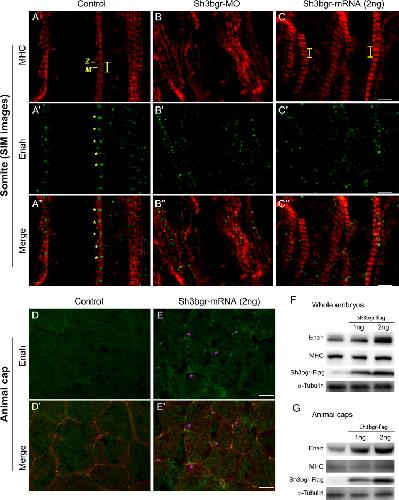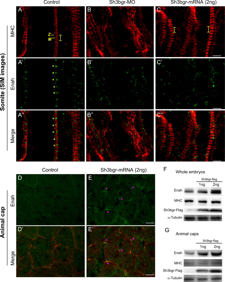 Fig. 5. Sh3bgr is an upstream regulator of Enah. AâC. Super resolution SIM images of sarcomeres in control (A) Sh3bgr knockdown (B), and Sh3bgr overexpressing embryos (C). Enah protein was labeled in green and MHC was labeled in red. The Z-line and M-band are indicated within a sarcomere. Both knockdown and overexpression of Sh3bgr delocalize Enah from the Z-lines. DâE. Enah staining in control (D) and Sh3bgr overexpressing (E) animal cap cells. In Sh3bgr overexpressing animal cap cells, the Enah protein is highly enriched in tri-junctional foci (asterisk). FâG. The western blot analysis showed that the endogenous Enah protein level was sharply increased in whole embryos (F) or animal cap tissues (G) upon overexpression of Sh3bgr. Scale bar (AâC) = 2µm Scale bar (D, E) = 10 µm.