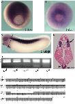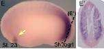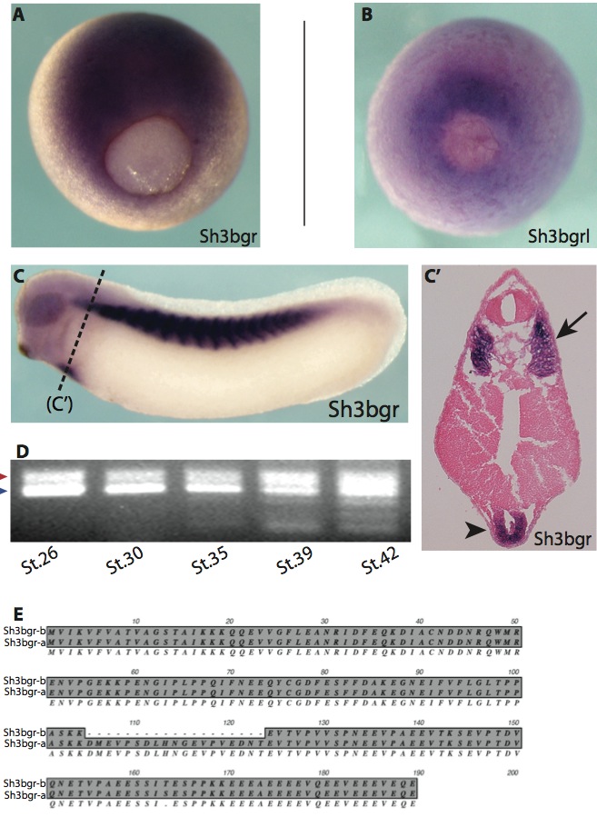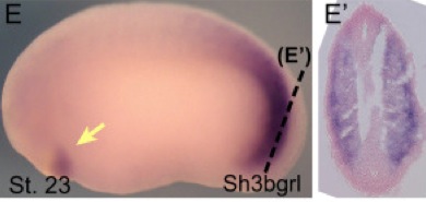 sh3bgrl (SH3 domain binding glutamate-rich protein like) gene expression in Xenopus laevis embryo, assayed via in situ hybridization, NF stage 23, lateral view, anterior right, dorsal up (E) and section through tail bud region (E'), dorsal up.