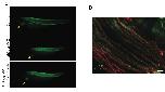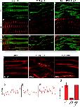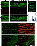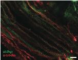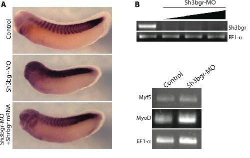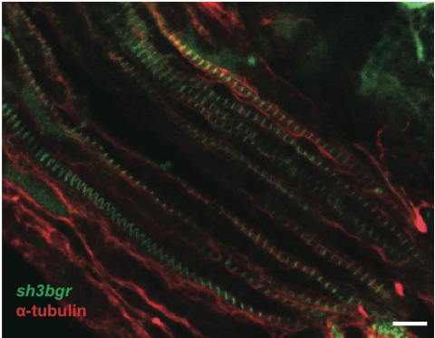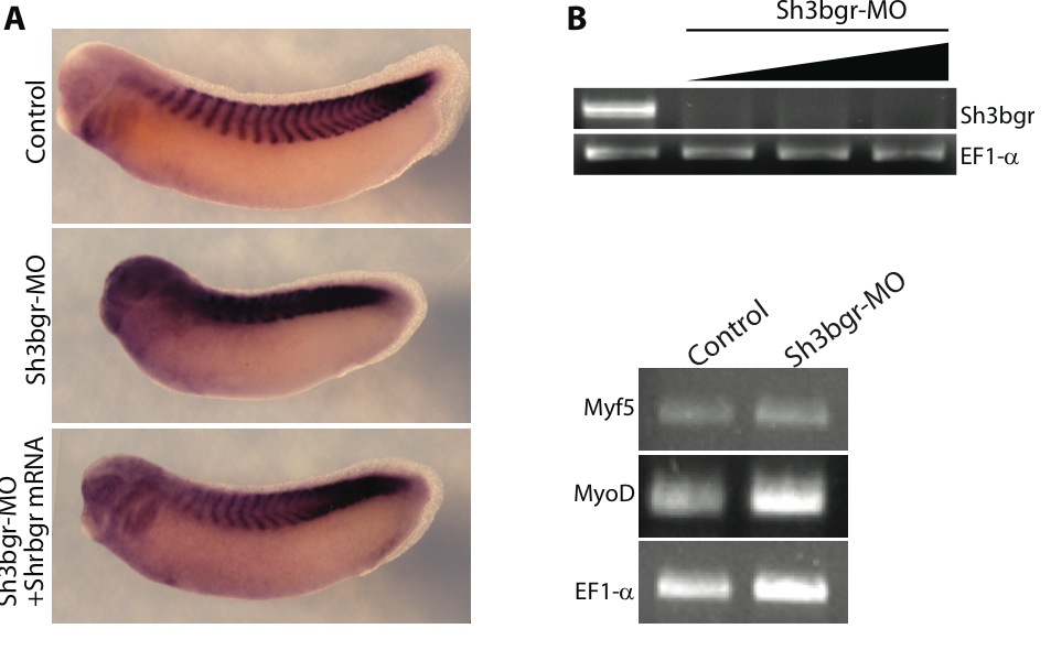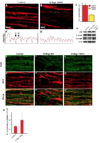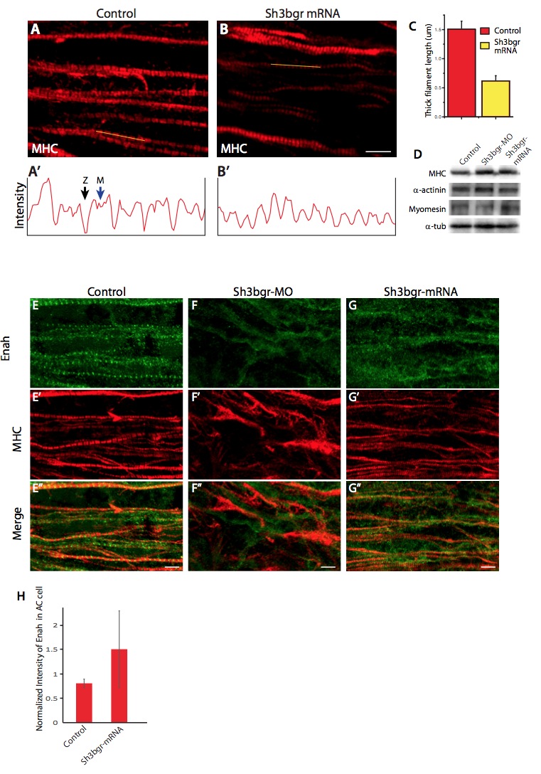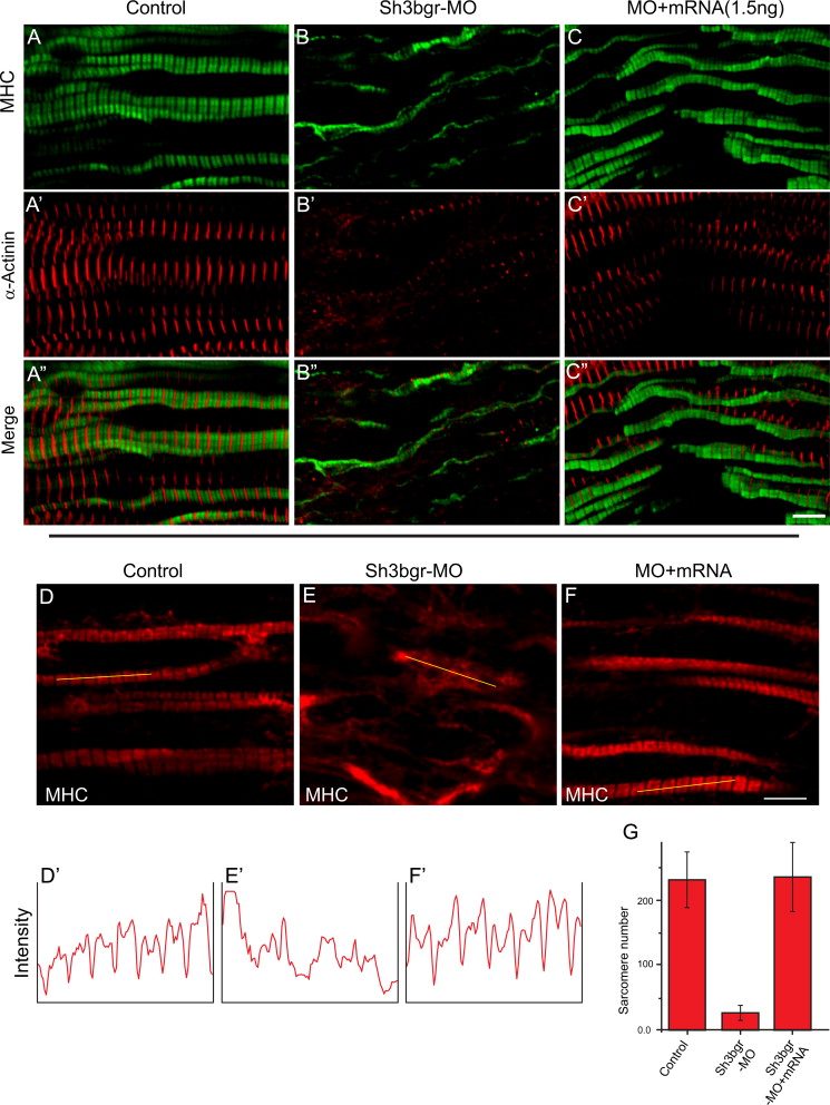 Fig. 3. sh3bgr is necessary for sarcomere formation. AâC. Stage 33 embryos were fixed and the coronal sections of somitic tissues were stained for α-actinin (Red) and MHC (Green). Knockdown of sh3bgr caused severe defects in the sarcomeres. Sh3bgr knockdown caused almost compete loss of sarcomere structures (B). Co-injection of Sh3bgr mRNA (1.5ng) with Sh3bgr-MO rescued sarcomere defects (C). DâF. Representative images of thick filaments. The fluorescent intensity plots of indicated muscle fibers are shown in (DââFâ). The average numbers of intact sarcomeres in each sample are shown in (G). Scale bar = 5 µm