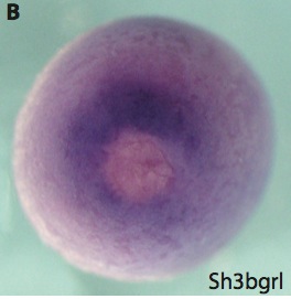 sh3bgrl (SH3 domain binding glutamate-rich protein like) gene expression in Xenopus laevis embryo, assayed via in situ hybridization, NF stage 12, blastoporal view, dorsal up.