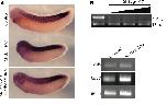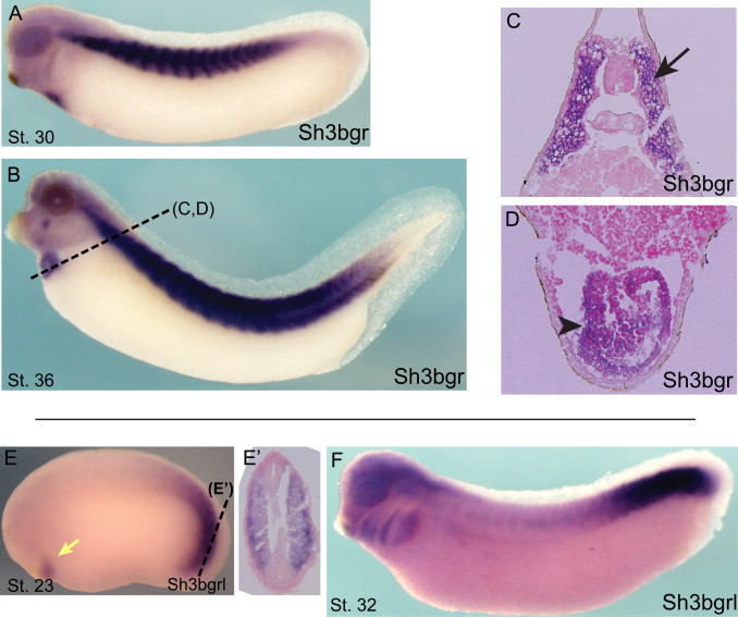 Fig. 1. sh3bgr is expressed in the skeletal muscles and heart tissues. Whole mount in situ hybridization showing that sh3bgr is expressed in the somites and heart at Stage 30 (A), Stage 36 (B). C, D. Sectioned samples shown in (B). E. sh3bgrl is expressed in the presomitic tissue and early cardiac tissue at Stage 23. F. At Stage 32, sh3bgrl is expressed in the pharyngeal arches and the presomitic expression was maintained.