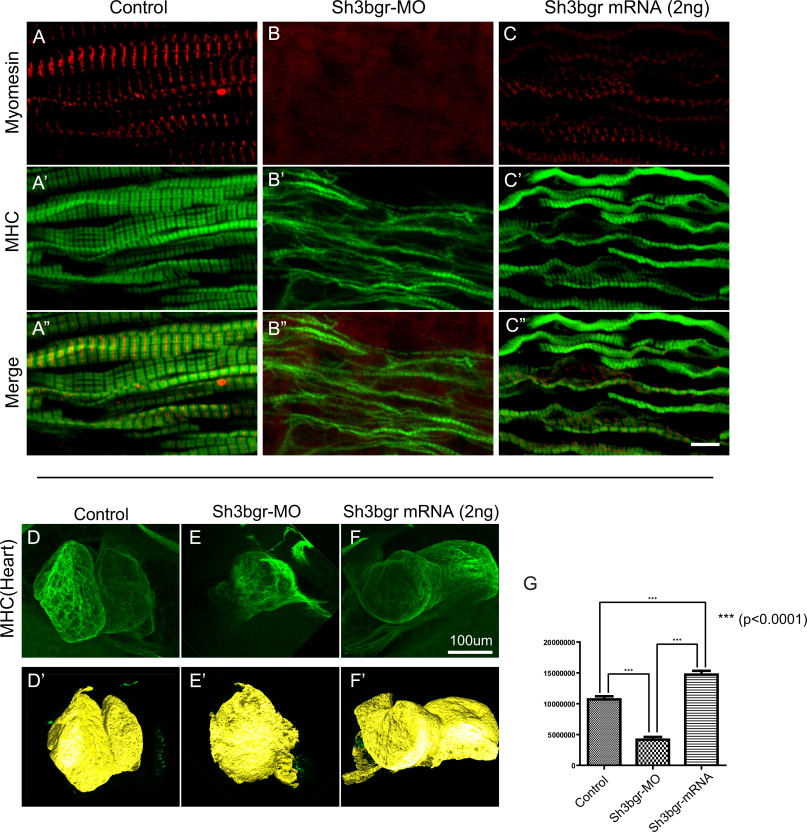 Fig. 4. Overexpression of Sh3bgr caused abnormal sarcomere formation and increased heart volume. AâC. Stage 33 embryos were fixed and the coronal sections of somitic tissues were stained for myomesin (Red) and MHC (Green). Overexpression of sh3bgr (2ng of Sh3bgr-flag mRNA) caused abnormally discontinuous thick filaments and mislocalizaiton of myomesin. D-F. Overexpression of Sh3bgr increased the heart volumes. The embryonic hearts were stained with anti-MHC antibody and the volumes of Stage 45 embryos were measured using the Imaris program. DââFâ. The surface views of 3D confocal images in (DâF) rendered using the Imaris program. The heart volume was plotted in (G). The numbers of embryos analyzed: Control-13, sh3bgr morphants-13, Rescue-13. Scale bar = 5 µm
