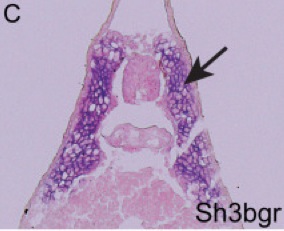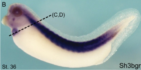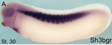 sh3bgr (SH3 domain binding glutamate-rich protein) gene expression in Xenopus laevis embryo, assayed via in situ hybridization, NF stage 30, lateral view, anterior left, dorsal up.