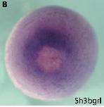 sh3bgr (SH3 domain binding glutamate-rich protein) gene expression in Xenopus laevis embryo, assayed via in situ hybridization, NF stage 11, blastoporal view, dorsal up.
