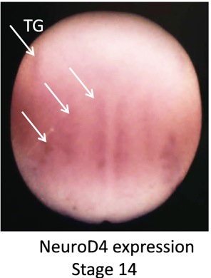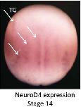 neurod4 (neuronal differentiation 4) gene expression in Xenopus laevis embryo, assayed via in situ hybridization, NF stage 14, dorsal view, anterior up.
