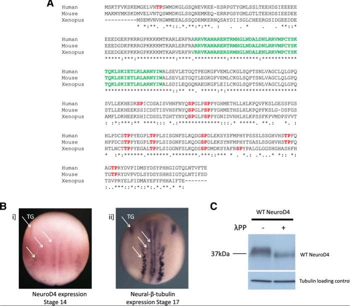 Fig. 1 NeuroD4 is expressed and phosphorylated during primary neurogenesis (A-C). a Protein sequence alignment for human, mouse and Xenopus NeuroD4 homologues using Clustal W. The conserved bHLH domain is indicated in green and SP/TP sites are highlighted in red. A consensus line is also shown below the alignment to indicate the degree of conservation of amino acids at each position: (*) denotes identical residues in all three sequences; (:) denotes highly conserved residues; (.) denotes weakly conserved residues. b Endogenous expression of NeuroD4 at stage 14 (i) and neural-β-tubulin at stage 17 (ii) was determined by whole mount ISH (white arrows correspond to zones of primary neurogenesis; TG = trigeminal ganglia). Dorso-ventral views, anterior up, stages as indicated. c Western Blot analysis of extracts from stage 13 embryos injected with an HA-tagged wild type (WT) NeuroD4 mRNA, either with or without protein phosphatase treatment. Tubulin was used as a loading control