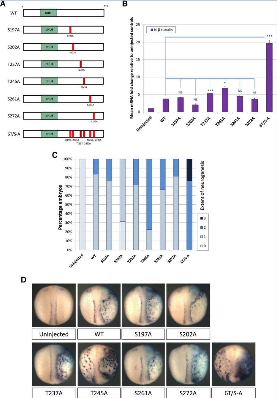 Fig. 4 Similar levels of proneural activity are seen amongst paired site mutants (a-d). a Schematic representation of the paired site phospho-mutant NeuroD4 constructs. Two-cell stage embryos were unilaterally injected with 100 pg mRNA of the respective NeuroD4 construct and assayed at stage 18 for expression of neural-β-tubulin by qRT-PCR (B[n = 3]), or whole embryo ISH (C[n = 62-79]) with representative images shown in (d). Views are dorso-ventral with injected side to the right; (p <0.05) = *; (p <0.025) = **; (p <0.0125) = ***