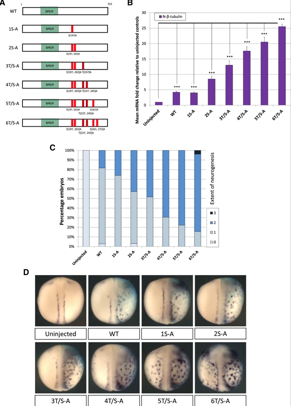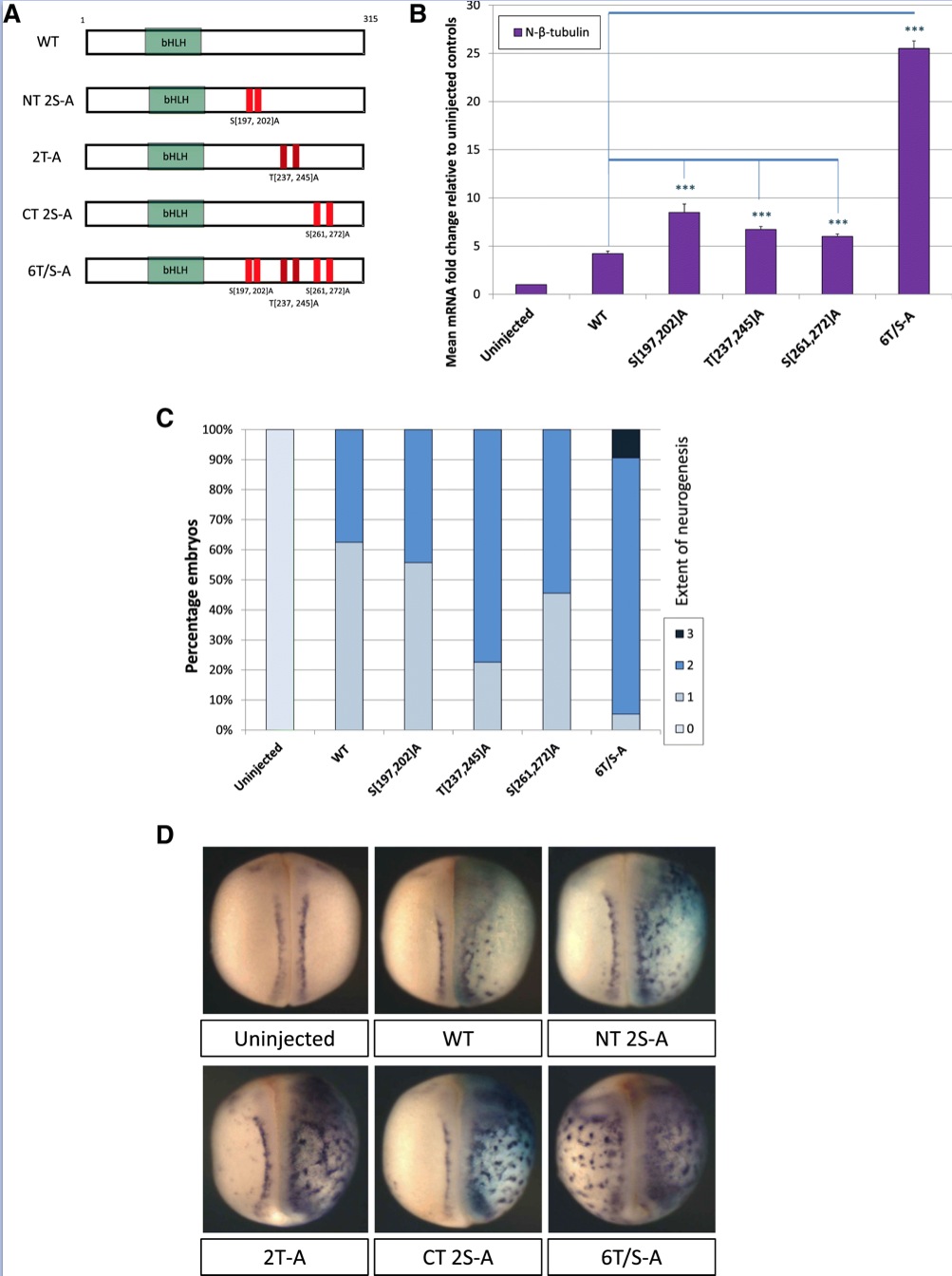 Fig. 5 Cumulative mutation of phosphorylation sites creates step-wise increases in proneural activity (a-d). a Schematic representation of the phospho-mutant series of constructs demonstrating the SP and/or TP sites that are mutated to AP sites in each. The series consists of cumulative mutation of sites, working from N to C termini. Two-cell stage embryos were unilaterally injected with 100 pg mRNA of the respective NeuroD4 construct and assayed at stage 18 for expression of neural-β-tubulin by qRT-PCR (B[n = 3]), or whole embryo ISH (C[n = 59-77]) with representative images shown in (d). Views are dorso-ventral with injected side to the right; (p <0.05) = *; (p <0.025) = **; (p <0.0125) = ***