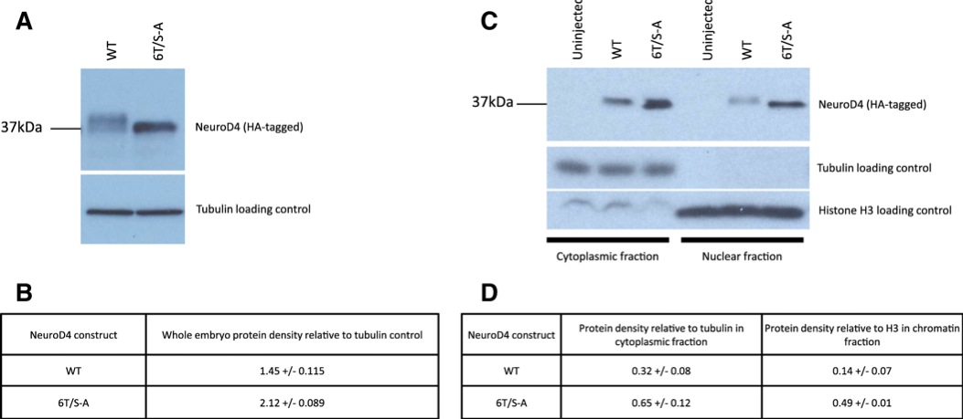 Fig. 7 6T/S-A NeuroD4 shows enhanced protein stability and enhanced chromatin binding relative to WT NeuroD4 (a-d). Embryos were injected at the one cell stage with 200 pg mRNA encoding HA-tagged versions of either WT or 6T/S-A NeuroD4. a Western blot analysis on extracts prepared from stage 13 embryos, with tubulin as a loading control. b The density of the protein band for WT or 6T/S-A NeuroD4 was quantified and expressed relative to the tubulin loading control of each sample. Mean values are shown from independent duplicate samples with the standard error of the mean. c At stage 14, cross-linking and chromatin isolation were performed prior to western blot analysis as before. No HA-tagged NeuroD4 protein was detected in the uninjected embryos confirming antibody specificity, and no tubulin protein was detected in the chromatin fraction. d NeuroD4 protein bands were again quantified relative to tubulin or histone H3 bands for cytoplasmic and chromatin fractions respectively. Mean values are shown from independent duplicate samples with the standard error of the mean.