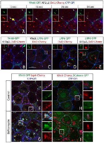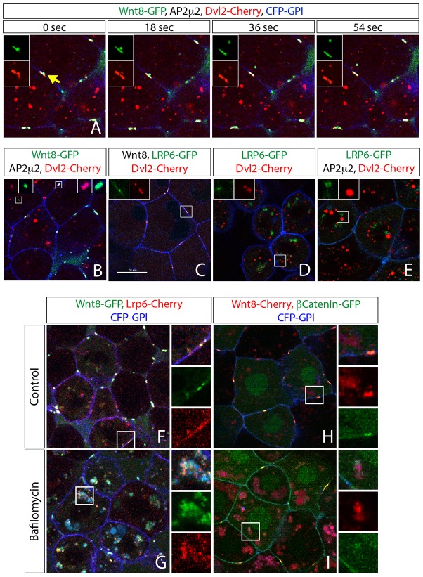 Fig. 3. Cell autonomous endocytosis of the signalosome. Confocal microscopy analysis of live zebrafish embryos that express 2â ng mRNA of the indicated constructs at 30â50% epiboly stage; all constructs were used at 2â ng, except Wnt8 (1â ng), CFP-GPI (1,2â ng) and Ap2μ2 (1,6â ng). Confocal images represent single z-sections. Constructs were expressed as indicated and are shown in the indicated colors together with membrane markers CFP-GPI (blue). (A) Still pictures of a time-lapse analysis (from supplementary material Movie 2) of endocytosis of Wnt8 (green) together with Dvl2 (red) from a signalosome. (BâE) Dvl2 does neither colocalize with Wnt8 nor with Lrp6, unless in the plasma membrane after induction by Wnt8 (B,C). (FâI) Embryos treated with 150â nM bafilomycin A1 for 1â hour before scanning show colocalization of Wnt8 with Lrp6 (F,G) or β-Catenin (H,I). Arrow in A indicates a membranous cluster of Wnt8 and Dvl2 that is going to be internalized. Magnified images represent boxed areas with split channels related to the indicated color code for injected constructs. |