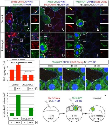 Fig. 4. Clonal analysis of signalosome internalization. Confocal microscopy analysis of live zebrafish embryos injected with a set of mRNAs of indicated constructs (2 ng Dvl2, 1,2 ng of CFP-GPI, 1,6 ng Ap2μ2 or Fz1) at one-cell stage and later at eight-cell stage injected with 0.25 ng Wnt8 and 0.1 ng CFP-Histone H2B into one cell only. For convenience, Wnt8-producing clones were marked by nuclear CFP (indicated by dashed lines). Confocal images represent single z-sections. (A,C) Controls. (E) Co-injection of Ap2μ2 morpholinos (MOs) at one-cell stage. (B,D,F) Embryos were treated with bafilomycin A1 for 1 hour before scanning. Magnified images represent boxed areas with split channels related to the indicated color code for injected constructs. (G) Manual quantification of intracellular Dvl2-Cherry vesicles in cells next to Wnt8 clone from (C–F). Error bars are given as +s.e. of ten independent samples each. *P<0.05; *** P<0.005; n.s., not significant (P≥0.05). (H) Automatic quantification after surface application (using Imaris software) of intracellular Wnt8-GFP total volume in 15 responding cells of three different embryos. Represented in volume per cell normalized to volume in control cells (1 = 25,6 µm3). (I) Still pictures of a time-lapse analysis of endocytosis of Wnt8 (green) together with Dvl2 (red) from a signalosome (supplementary material Movie 3). (J) Experimental procedure to generate clones displayed in (A–F and (I). |