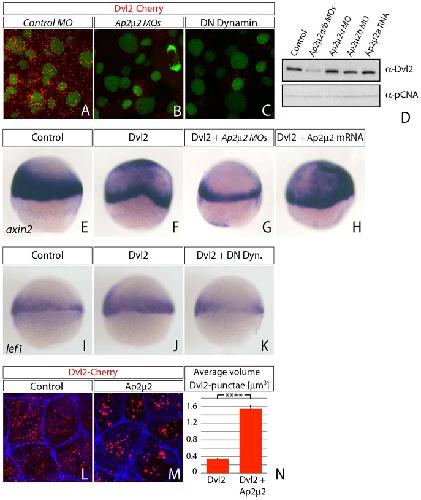 Fig. 6. Dvl2 stability and activity depends on Ap2μ2 function. (AâC,L,M) Confocal microscopy analysis of live zebrafish embryos that express synthetic mRNA of the indicated constructs and morpholino (MO) oligomers against ap2μ2a/b at 40% epiboly stage. (AâC) Intracellular clusters of Dvl2 are hardly detectable in Ap2μ2 double-morphant embryos (B) and in embryos that express dominant-negative (DN) Dyn (C) compared to control. (D) Western blot analysis of Ap2m2 morphant embryos and Ap2m2-mRNA-expressing embryos shows a reduction of endogenous Dvl2 in double-morphant embryos. PCNA was used as loading control. (EâK) In situ hybridization with axin2 and lef1 probed in embryos injected with indicated constructs at blastula-stage. Embryos shown are representative of 30â40 stained embryos; the lateral view is shown (the dorsal side is on the right). (L,M) Ectopic expression of Ap2μ2 mRNA leads to increased size of Dvl2 aggregate. (N) Quantification of data shown in L and M. Error bars are given as +s.e. of five independent samples each. ****P<0.001. |