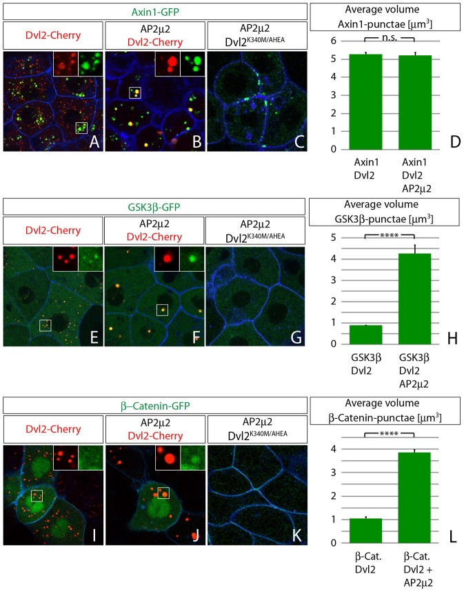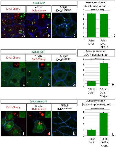 Fig. 8. Members of the transducer complex cluster intracellularly with Dvl2. Confocal Images represent single z-sections of live embryos at 40% epiboly stage. Indicated constructs were injected as synthetic mRNA (2â ng each, 1,6â ng of Ap2μ2, 1,2â ng CFP-GPI) at one-cell stage and displayed with indicated colors. Subcellular distribution of Axin1 (AâD), GSK3β (DâH) and β-catenin (IâL) in the context of Dvl2 co-expression. (A,B) Axin1 is distributed as intracellular punctae that colocalize with Dvl2 (A) even in the presence of Ap2μ2 (B). (C) Axin1 is found predominantly in plasma membrane clusters after co-expression of Ap2μ2 and DvlK340M/AHEA double mutant mRNA. (D) Automatic quantification of punctae size in (A,B) as volume after surface application using Imaris software. GSK3β (DâH) clusters in Dvl2-positive aggregates and colocalization can be improved by co-expression of Ap2μ2 mRNA. (G) GSK3β distribution is unaltered (compare with supplementary material Fig. S3E) after co-expression of Ap2μ2 and DvlK340M/AHEA double mutant mRNA. (H) Quantification of punctae size in (E,F). (I) β-Catenin clusters are less apparent in Dvl2-positive aggregates, but colocalization can be improved by co-expression of Ap2μ2 mRNA (J). (G) β-Catenin distribution is unaltered (compare with supplementary material Fig. S3G) after co-expression of Ap2μ2 and DvlK340M/AHEA double mutant mRNA. (L) Quantification of punctae size in (E,F). Error bars are given as +s.e. of ten independent samples each. ****P<0.001; n.s., not significant (Pâ¥0.05). |