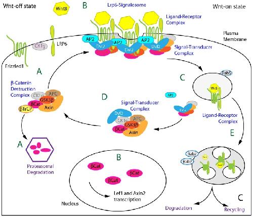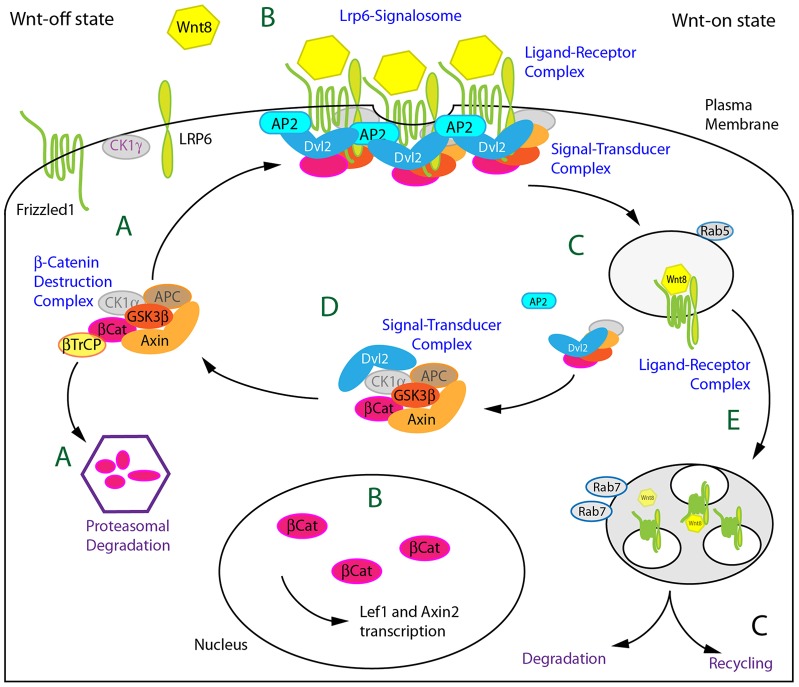 Fig. 9. Model for Ap2μ2 function. Schematic drawing of Ap2μ2 action during canonical Wnt/β-Catenin-signaling. (A) In the Wnt-off state, the β-Catenin destruction complex is active and degrades β-Catenin. (B) In the Wnt-on situation, ligand is bound to Fz receptor and Lrp6 co-receptor, thereby inducing Ap2-dependent recruitment of Dvl2 to Fz and signalosome formation at the cytoplasmic membrane. (C) Subsequent internalization is mediated by the interaction of Dvl2 with Ap2μ2 and leads to the sequestration of Axin, CK1γ, GSK3β and β-Catenin in cytoplasmic aggregates. The ligand-receptor complex is routed to late endosomes for degradation or recycling (E), whereas the signal-transducer complex (D) maintains signaling activity by stabilizing Dvl2 and by, for example, keeping GSK3β inactive. Subsequently, the destruction complex becomes activated again by, for example, phosphorylation of Axin1, leading to the initial Wnt-off state (A). |