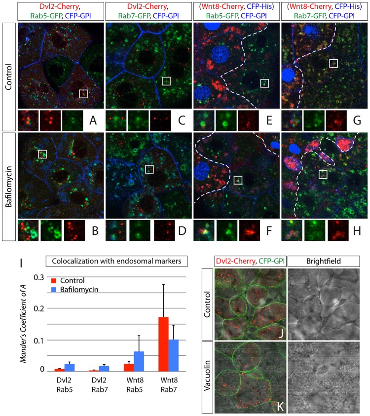 Fig. 5. Colocalization of Wnt8 and Dvl2 with endosomal markers. Confocal microscopy analysis of Rab5-GFP or Rab7-GFP transgenic zebrafish embryos that express mRNA of indicated constructs at 30–50% epiboly stages. (A–D) Expression of Dvl2 in Rab5-GFP (A,B) or Rab7-GFP (C,D) zebrafish transgenic line. Dashed lines in E–H indicate the border between Wnt8-positive cell clone (left) and host tissue (right). Confocal images represent single z-sections. Constructs were expressed as indicated and are shown in the indicated colors together with membrane marker CFP-GPI (blue). (E–H) Clonal expression of Wnt8 together with nuclear marker His-CFP in Rab5-GFP (A,B) or Rab7-GFP (C,D) zebrafish transgenic line transiently expressing CFP-GPI. (I) Quantification of colocalization of Dvl2 with Rab5 and Wnt8 with Rab7. Analysis was performed using the Imaris Coloc software module function. Thresholds were set manually and Manders Coefficient for either Dvl2 or Wnt8 was calculated automatically. Error bars represent +s.e. of five independent samples each. (J) Control embryos treated with 0.3% DMSO, (K) Embryos treated with Vacuolin-1 in 0.3% DMSO for 1.5 hours before scanning. |