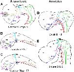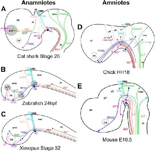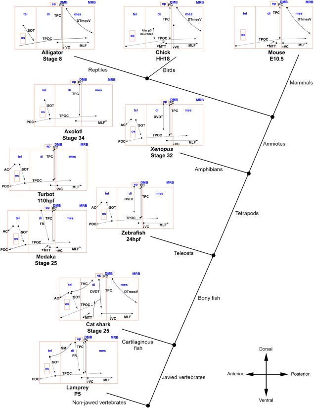 Figure 2. Schematic representation of the early axon scaffold tracts throughout vertebrate evolution. Lamprey is an example of a nonjawed vertebrate. The first divergence represented for jawed vertebrates is cartilaginous fish with cat shark. The next divergence is for the bony fish with zebrafish, turbot and medaka shown as representatives. The next major divergence is for the tetrapods, with Xenopus and axolotl representing amphibians. The next divergence to be made is the amniotes. Chick and alligator are examples for birds and reptiles, respectively. With further divergence for the mammals, mouse is used as an example. The neuron origin is represented by a black circle and the arrowheads indicates the direction of the axonprojection from their neurons (where known). For abbreviations see Table 1.Download figure to PowerPoint