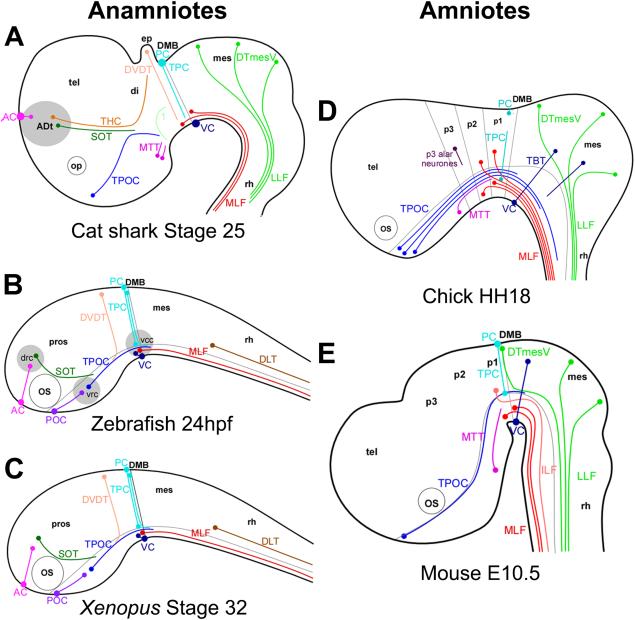 Figure 1. Schematics of the established early axon scaffold in the vertebrate brain of model organisms. Each tract that forms in the anamniotes or amniotes is colour coded to show where the neurons are located and the projection of their axons. A: Cat shark, stage 25 (80 somites) (adapted from Ware et al., 2014b). B: Zebrafish, 24 hpf. Gray circles highlight neuronal populations and older terminology for population names. C: Xenopus stage 32 (26 somites). D: Chick HH18 (31 somites) (adapted from Ware and Schubert, 2011). E: Mouse E10.5 (33â37 somites). Transversal gray lines mark the prosomeric boundaries. Longitudinal gray line marks the alar/basal boundary. For abbreviations, see Table 1.Download figure to PowerPoint