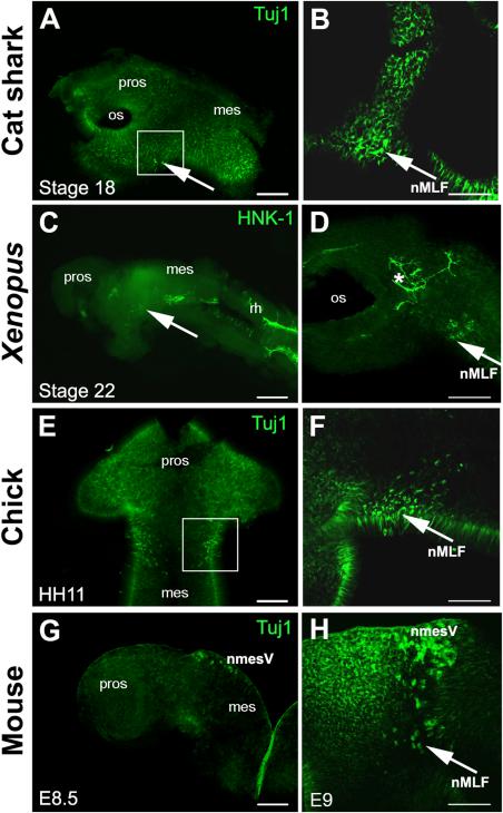 Figure 3. Comparison of the initial neurons that arise in the cat shark, Xenopus, chick, and mouse embryonic brains. AâF: The first neurons to arise in the rostral brain are MLF neurons in (A,B) cat shark (Tuj1) at stage 18 (arrow) (adapted from Ware et al., 2014b), (C,D) Xenopus (HNK-1) at stage 22 (arrow), asterisk shows peripheral staining, and (E,F) chick (Tuj1) at HH11 (arrow) (adapted from Ware and Schubert, 2011). G: In mouse (Tuj1), the first neurons give rise to the DTmesV at E8.5. H: The first MLF neurons appear at E9 (arrow). A,E: White box indicates higher magnification from the same embryo in B and F. For abbreviations, see Table 1. Scale barsâ=â100âµm.Download figure to PowerPoint