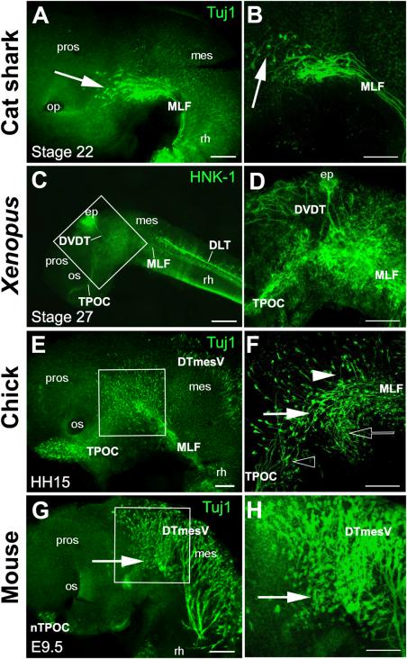Figure 4. Comparison of the developing early axon scaffold at an intermediate stage in the cat shark, Xenopus, chick, and mouse embryonic brains. All images are in lateral view of whole-mount embryos. More neuron populations are forming and neurons are projecting axons to form tracts. A,B: Cat shark (Tuj1), Stage 22 (adapted from Ware et al., 2014b), scattered neurons located rostral to the MLF axon tract (arrow). Scattered neurons are present, rostral to the MLF tract (arrow in B). C,D: Xenopus (HNK-1), Stage 27. The DVDT, TPOC and DLT have formed tracts. E,F: Chick (Tuj1), HH15. The TPOC and DTmesV have started forming tracts. The MLF is formed from three populations of neurons: central (arrow), ventral (unfilled arrow) and dorsal (arrowhead). MTT neurons are located rostrally to the MLF neurons (unfilled arrowhead). G,H: Mouse (Tuj1), E9.5. Ventral neurons located in the diencephalon and mesencephalon that belong to the nMLF (arrow). C,E,G: White box indicates higher magnification from the same embryo in D, F, and H. For abbreviations see Table 1. Scale barsâ=â100âµm.Download figure to PowerPoint