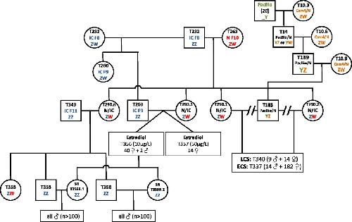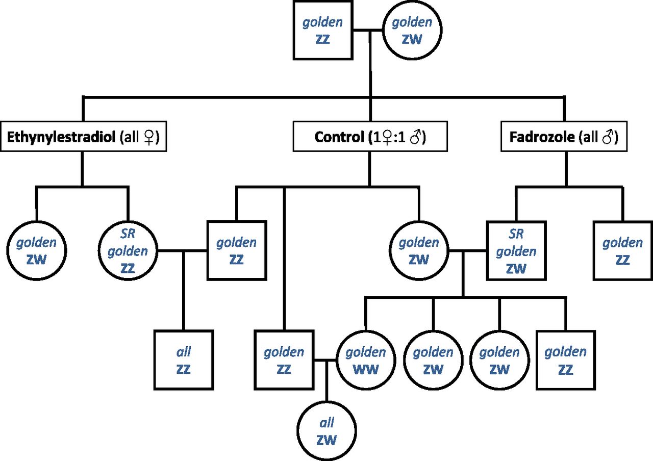 Fig. S1. Pedigree chart of the golden animals used in sex-reversal experiments (estradiol and fadrozole treatments). SR indicates sex-reversed individuals.